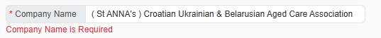 <input class="form-control required text-box single-line" id="Name" maxlength="200" name="Name" placeholder="Enter Name" type="text" value="( St ANNA's ) Croatian Ukrainian & Belarusian Aged Care Association">